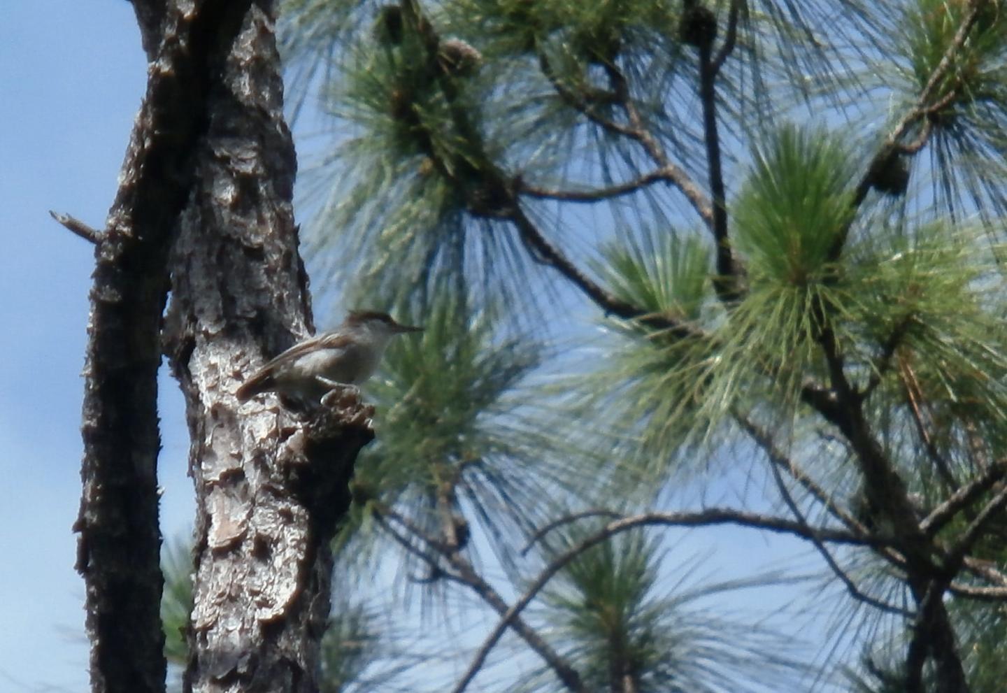 The Bahama Nuthatch has a long bill, a distinctive high-pitched squeaky call, and nests only in mature pine trees. There had been a sharp decline in its population crashing from an estimated 1,800 in 2004 to just 23 being seen in a survey in 2007. The decline likely began in the 1950s due to habitat loss due to timber removal, and more recently due to hurricane damage, storm surges having killed large areas native forest.