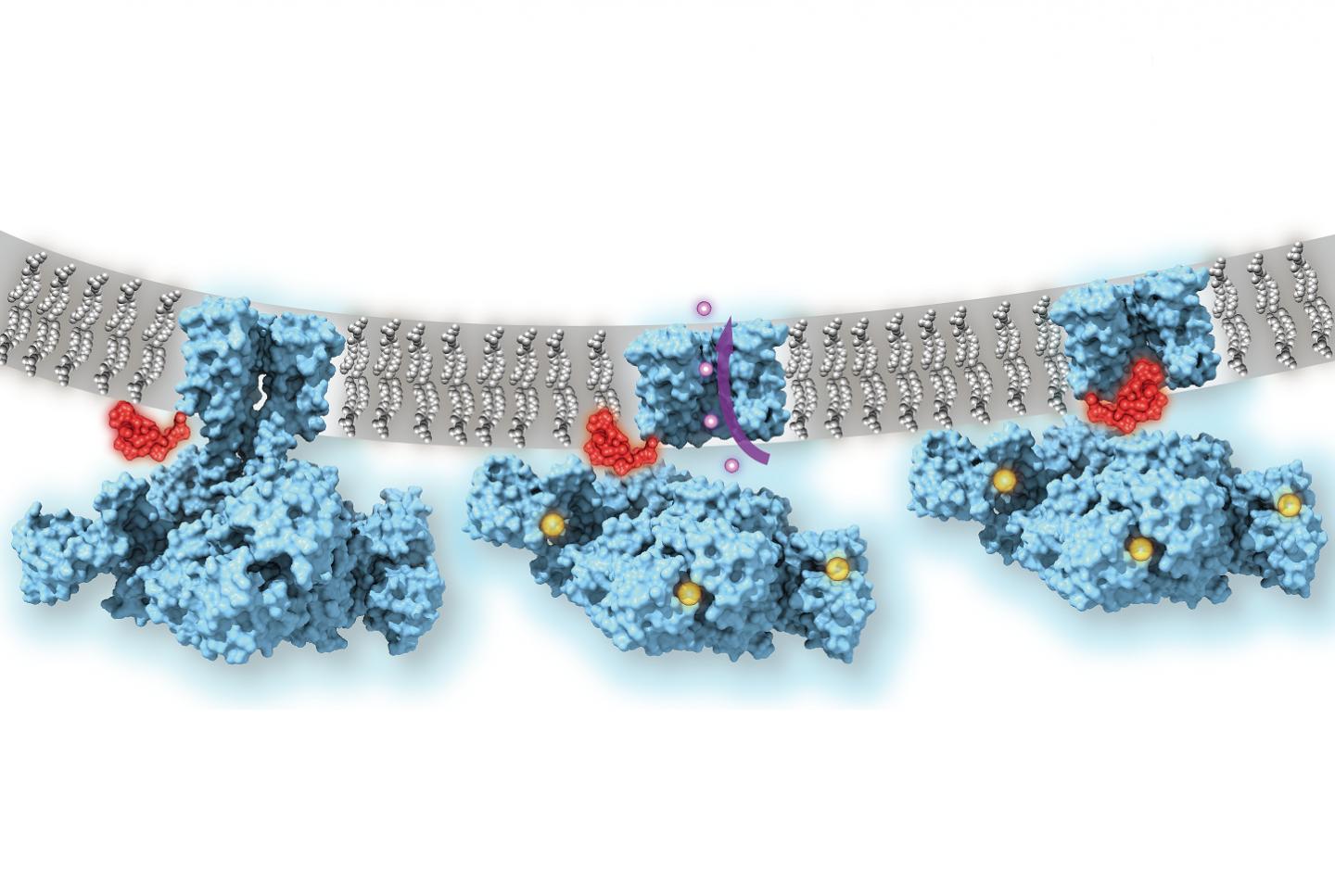 image: Calcium-gated potassium channel MthK in closed, open and inactivated states, from left to right. Channel structure (blue), with one subunit removed for clarity; calcium ions (yellow); potassium ions (purple); membrane (grey); N-terminal inactivation peptide (red). The location of the peptide in the inactivated channel was identified in the structural analysis, whereas the location shown in closed and open channels is hypothetical.