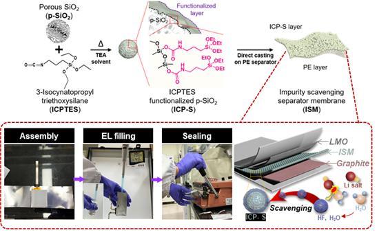 To solve this issue, studies have been conducted to suppress impurities - such as moisture or hydrofluoric acid - by injecting additives into the electrolytes. But these can cause unwanted side reactions during the battery operation. In fact, when batteries are activated at a high temperature (50? or higher), even a small bit of moisture causes faster performance deterioration. Therefore, there is a need for a material capable of trapping moisture and impurities in the battery without adverse electrochemical reactions to the additives.