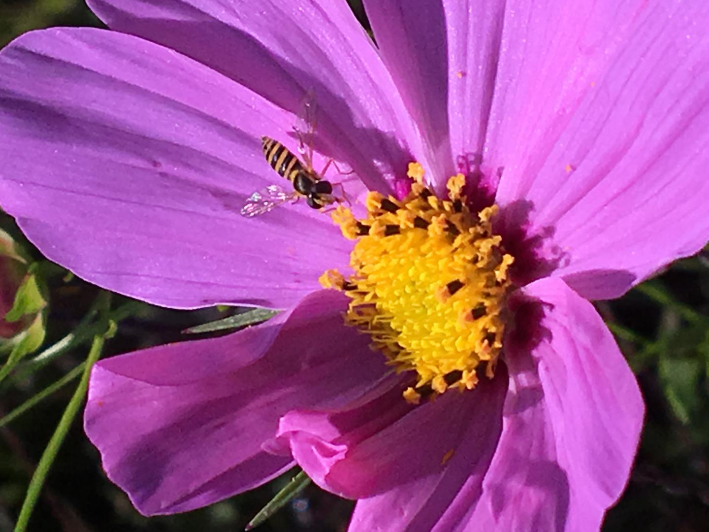 image: Syrphid flies mimic bees with their coloring. They also can act as pollinators.