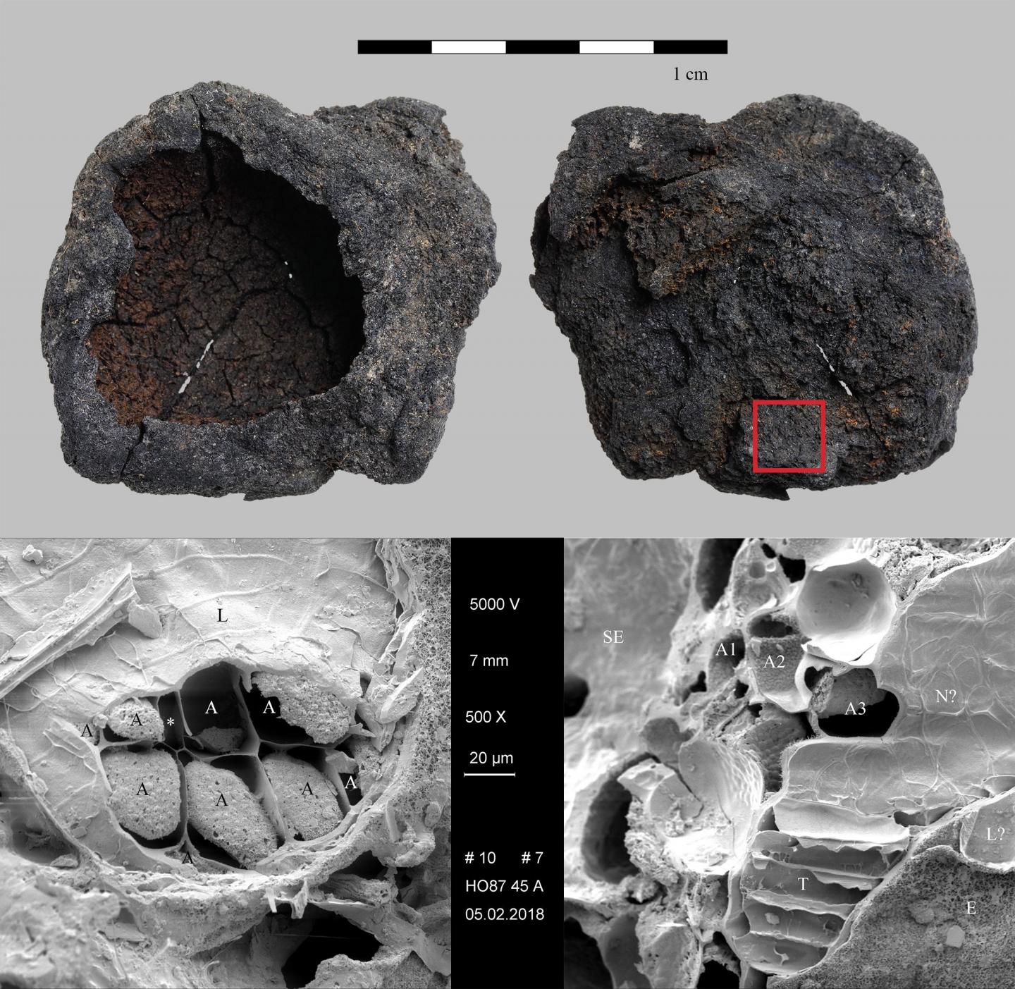 image: The bowl-shaped charred cereal product ("brei mit napfförmiger oberfläche") from Hornstaad--Hörnle IA.