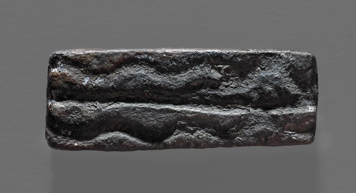 image: Rectangular bronze weight (around 4.8 cm long; 29.8 g) from Salcombe, Devon, England.
