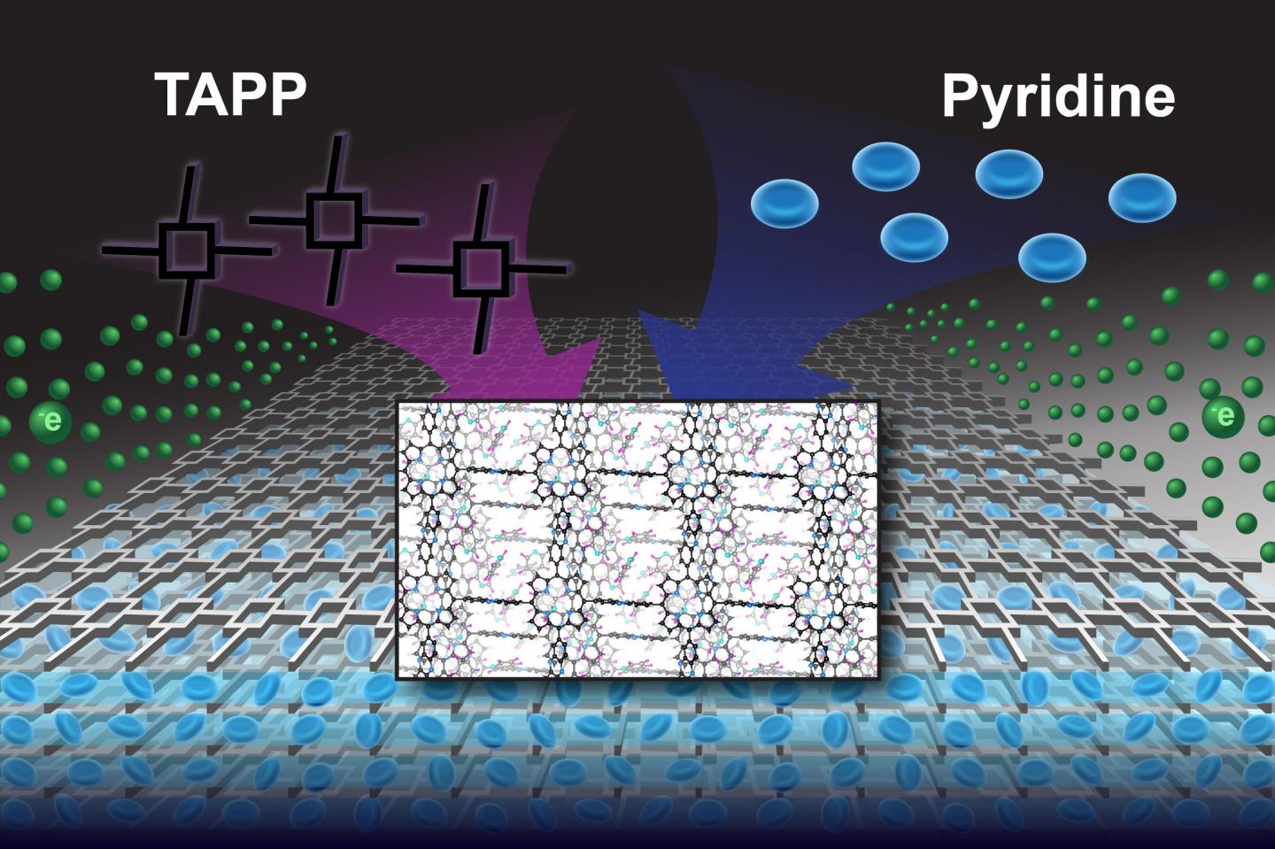 image: A graphical representation of the covalent organic frameworks, or COFs, created by a collaborative team of experimental and theoretical chemists. Large porphyrin structures (labelled as TAPP) form an egg carton-like lattice that forms multiple stacks, with pyridine molecules (shown in blue) filling the spaces in between the layers. An electrical current is depicted in green.