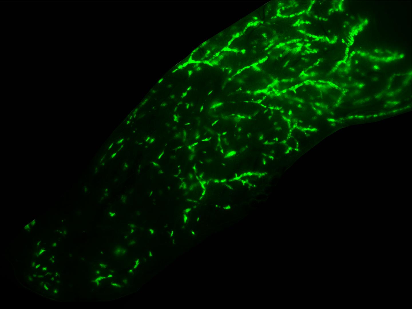 image: Fluorescence stereo micrograph of a mouse mammary gland intraductally injected with normal human breast epithelial cells. Credit: Marie Shamseddin (EPFL).