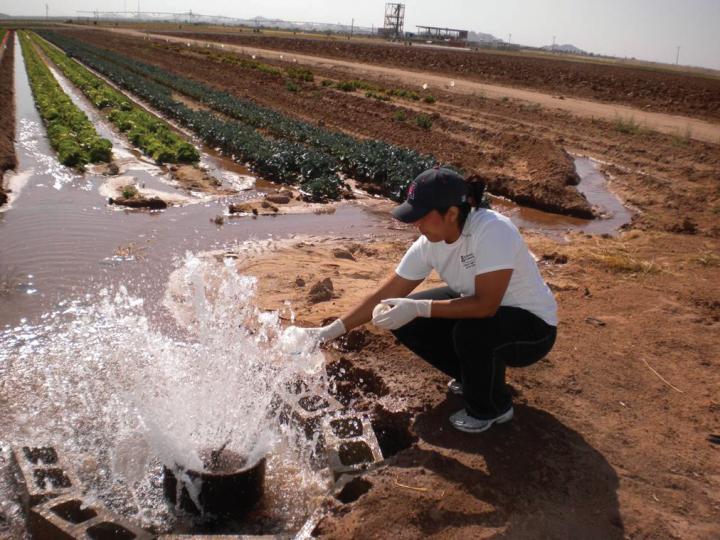image: A University of Arizona graduate student collects a water sample from an irrigation system.