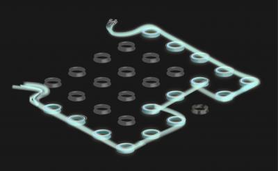 Conception for the proposed JQI fault-tolerant photon delay device for a future photon-based microchip. The devices ordinarily have a single row of resonators; using multiple rows like this provides alternative pathways for the photons to travel around any physical defects.