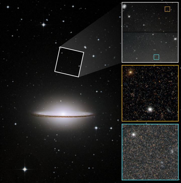 image: On the left is an image of the Sombrero galaxy (M104) that includes a portion of the much fainter halo far outside its bright disk and bulge. Hubble photographed two regions in the halo (one of which is shown by the white box). The images on the right zoom in to show the level of detail Hubble captured. The orange box, a small subset of Hubble's view, contains myriad halo stars. The stellar population increases in density closer to the galaxy's disk (bottom blue box). Each frame contains a bright globular cluster of stars, of which there are many in the galaxy's halo. The Sombrero's halo contained more metal-rich stars than expected, but even stranger was the near-absence of old, metal-poor stars typically found in the halos of massive galaxies. Many of the globular clusters, however, contain metal-poor stars. A possible explanation for the Sombrero's perplexing features is that it is the product of the merger of massive galaxies billions of years ago, even though the smooth appearance of the galaxy's disk and halo show no signs of such a huge disruption.