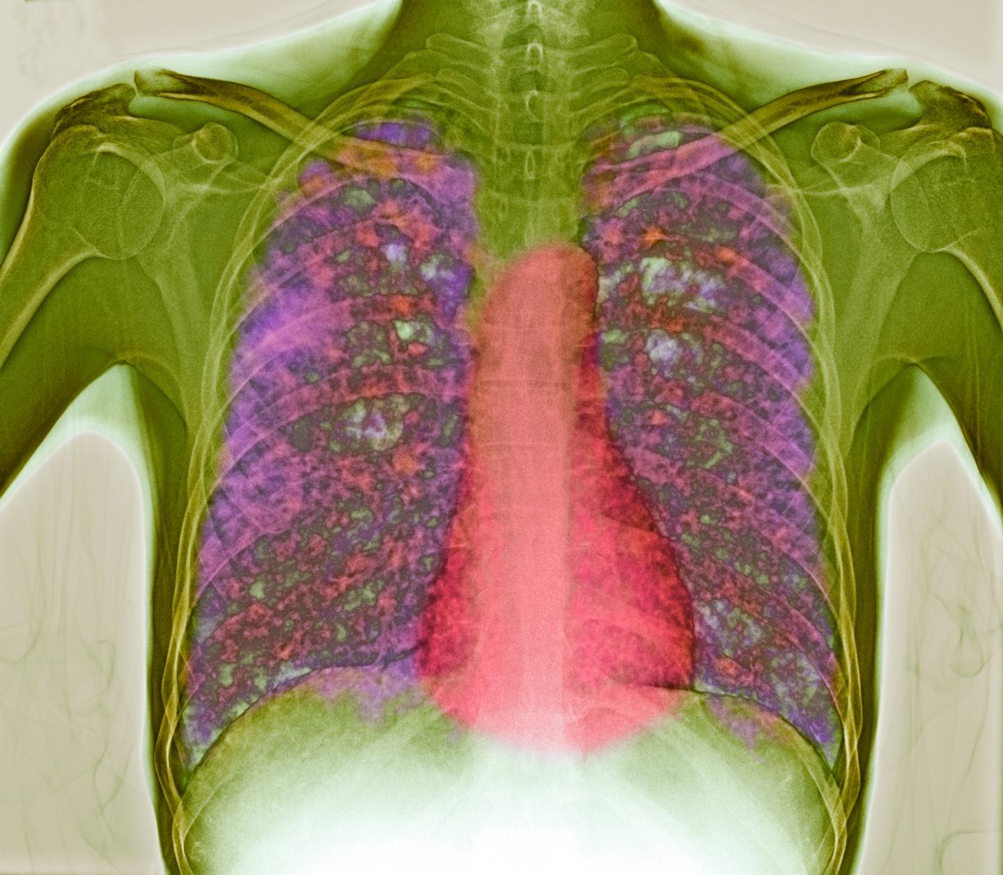 image: This is a colored X-ray of a patient's chest showing disseminated, or miliary, tuberculosis (TB) in the lungs and if left untreated, it has almost 100 percent mortality rate. The lungs contain lesions (tubercles, pink) consisting of infected dead tissue. Using mouse models of TB, Tzelepis et al, have identified the critical role of mitochondrial Cyclophilin D for regulating T cell mediated immunity in disease tolerance independent of host resistance to Mycobacterium tuberculosis.
