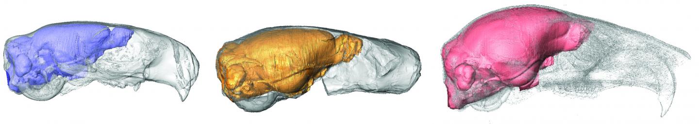 image: Virtual brain casts of rodent species Cedromus wilsoni, Protosciurus cf. rachelae and Sciurus carolinensis