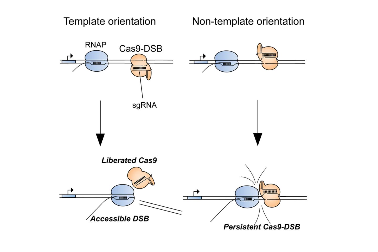 image: UIC researchers show persistent Cas9 binding to a double strand break causes CRISPR genome editing to fail about 15 percent of the time. When RNA polymerases collide with Cas9 from one direction (template orientation), they can dislodge Cas9 and increase genome editing efficiency.