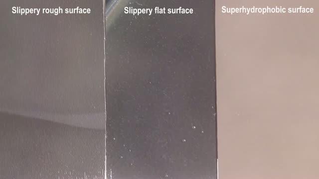 video: This video shows the effectiveness of a slippery rough surface (left) in channeling and directing water droplets at a higher rate than the other two surfaces. Developed by researchers at the University of Texas at Dallas and Penn State, and inspired by surfaces found in nature, the material represents a new way of optimizing water harvesting applications. The research was published in the journal Science Advances.