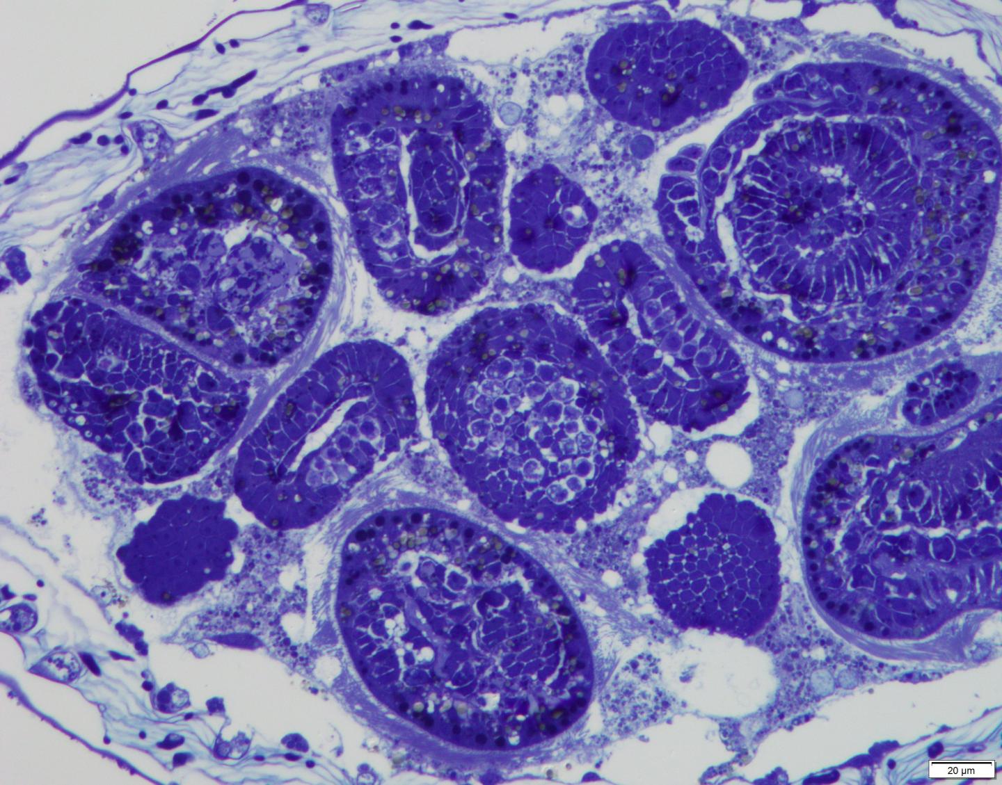 image: The histological section of a gonozooid that is filled with larvae and embryos embedded in the syncytial placenta (light microscopy).