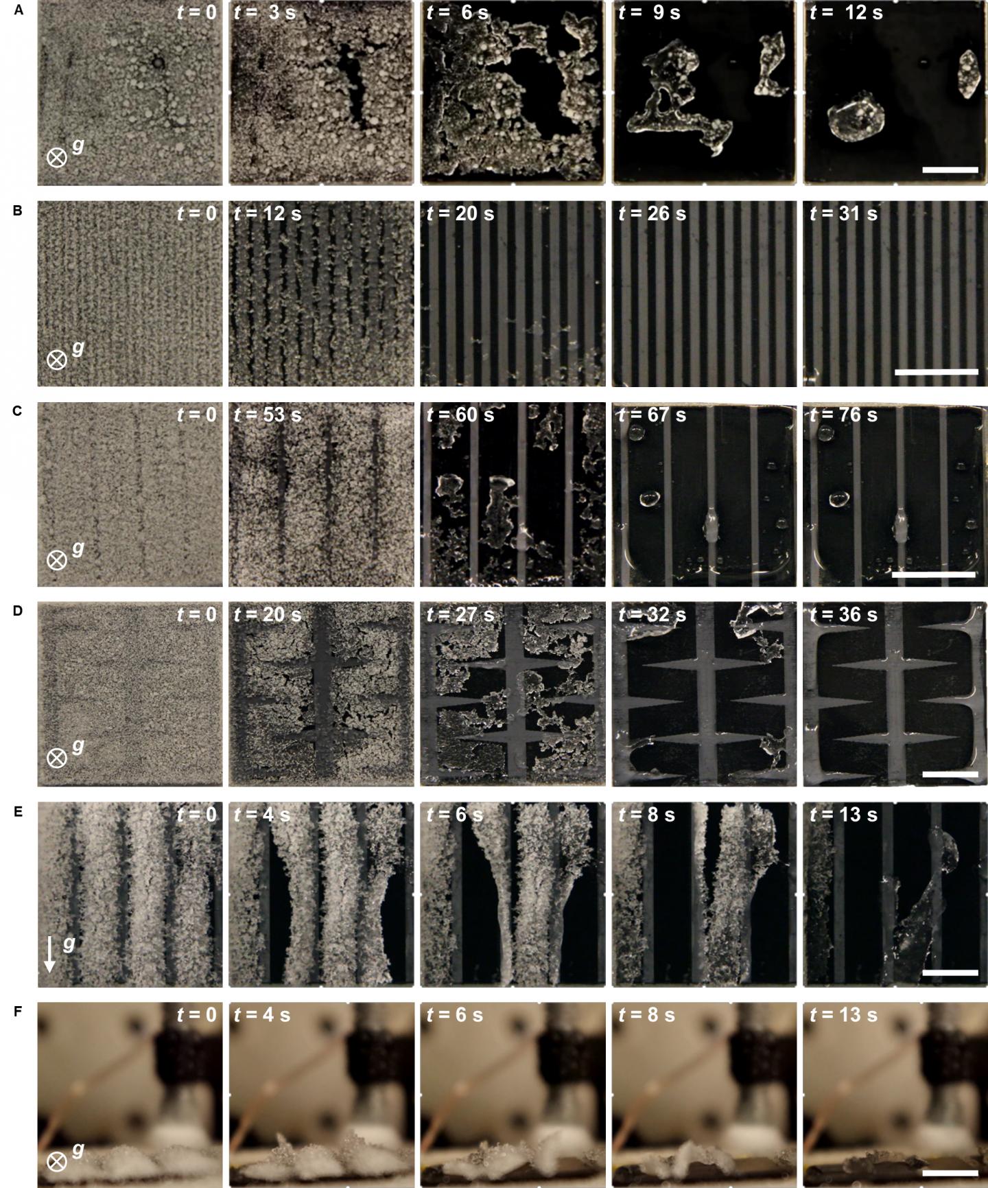 image: Time-lapse images of dynamic defrosting on superhydrophobic and biphilic surfaces. The time t = 0 represents the instant when melting of frost was first observed visually.
