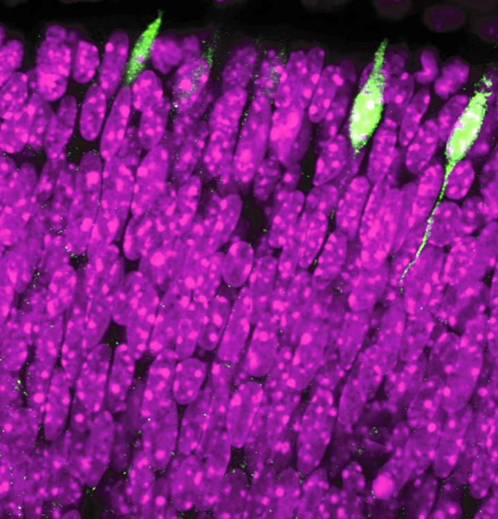 image: Photoreceptors cells responsible for colour vision. By sequencing one cell at a time, the researchers identified a gene (Rbp4) present in a small number of cells (in green). In purple, photoreceptors in which the Rbp4 gene is not activated.