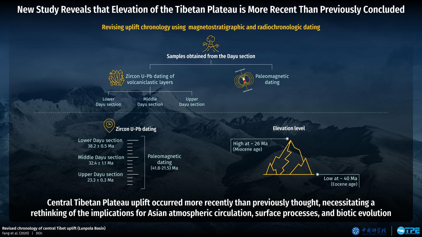 Using magnetostratigraphic and radiochronologic dating, the study found that low-elevation tropical fossils retrieved from the central Third Pole were deposited about 40 million years ago. However, an analysis of paleosols (fossil soils) using oxygen paleoaltimetry showed that paleosols corresponding with the elevation of the present day date from about 25.5 Ma to 21 Ma, rather than over 35 Ma - the figure often previously used to date the age of the Tibetan Plateau.