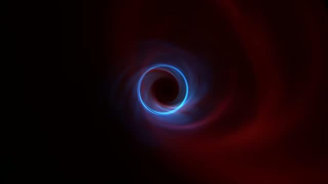 video: Three color animation showing results of an M87 simulation, red shows emission at long radio wavelengths, blue shows emission at 1.3mm (the wavelength the EHT uses), and green shows emission at 0.87 mm wavelengths.