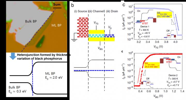 In the study featured in Nature Nanotechnology last month, Professor Cho's team reported a natural heterojunction TFET with spatially varying layer thickness in black phosphorous without interface problems. They achieved record-low average subthreshold swing values over 4-5 dec of current and record-high, on-state current, which allows the TFETs to operate as fast as conventional CMOS transistors with as much lower power consumption.