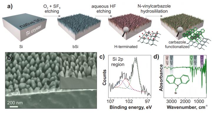 "Combination of unique morphological and optical properties of black silicon being combined with easy-to-implement methods of surface chemistry used to functionalize silicon surface with carbazole molecules allowed to achieve unprecedented sensitivity. Our sensor is able to detect nitroaromatic compounds at concentrations down to ppt (part per trillion or 10-10 %). Extremely broad dynamic measurement range is caused by the unique spiky morphology of black silicon that provides uneven local concentration of carbazole molecules creating surface sites with different sensitivity," explained Alexander Mironenko, the designer of the sensor, and a senior research associate at the Institute of Chemistry, FEB RAS.