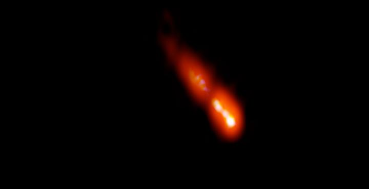 In this image, the brightest radio emission comes from the galaxy's core, at bottom right. The jet is propelled by the gravitational energy of a supermassive black hole at the core, and moves outward, toward the upper left. The jet seen here extends some 1,600 light-years, and shows structure within it.