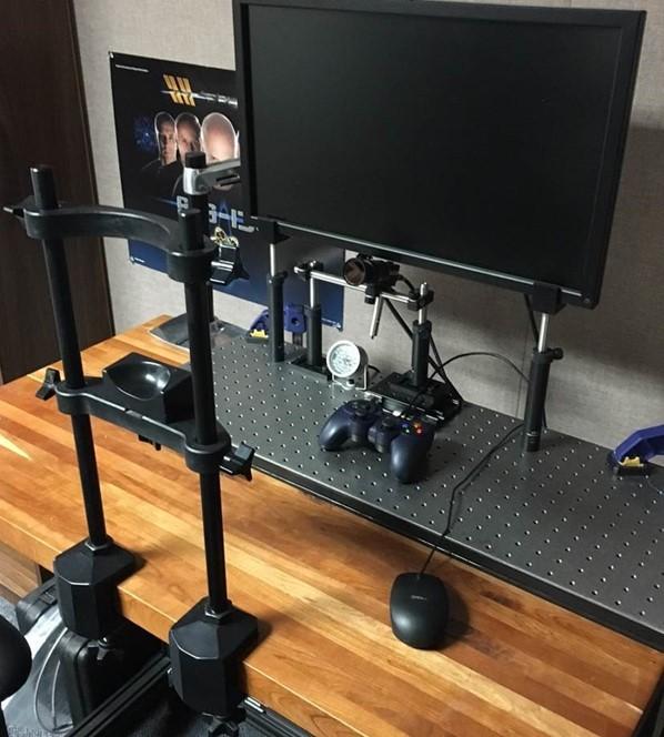 image: The eye measurement assessment set-up (shown above) consists of a chin/forehead rest, an infra-red camera and lamp, high-resolution gamer display and game controller, with appropriate software to generate our moving visual stimuli and compute 21 specific eye measurements.