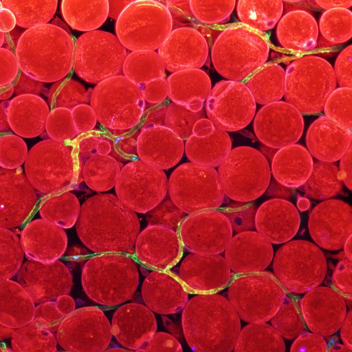 image: Fatty acid transporters (CD36; blue) in blood vessels (green), whose overlapping shown in yellow green, transverse around fat cells (red) under the skin.