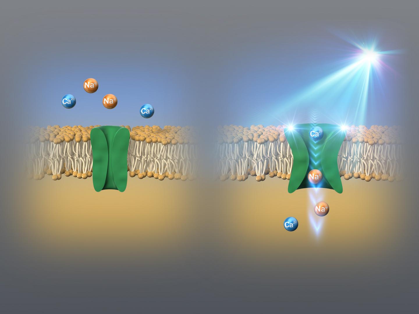 image: KnChR allows sodium ions and calcium ions to pass through in the presence of indigo light.