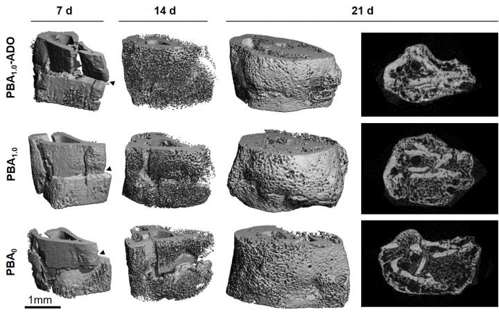 image: This graphic shows the healing progress of a fracture in a mouse treated with a new type of bone bandage that traps native adenosine (top), is preloaded with external adenosine (middle), and has no adenosine at all. The sequestered adenosine clearly helps the breaks heal faster to the naked eye up to 14 days, with cross sections of the bones showing more density and vascularization after 21 days.