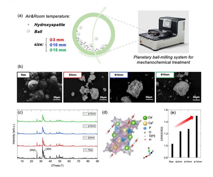 image: SEM images reveal that compared to loosely-packed particles in raw HAp, mechanochemically treated HAps show agglomerates of close-packed particles whose size grows with increasing ball diameter. The I(300)/I(200) pattern shows that surface tailoring happens predominantly on c plane.