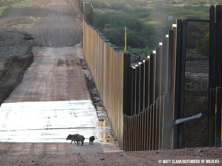 image: A family of javelinas encounters the wall on the U.S.-Mexico border near the San Pedro River in southeastern Arizona.