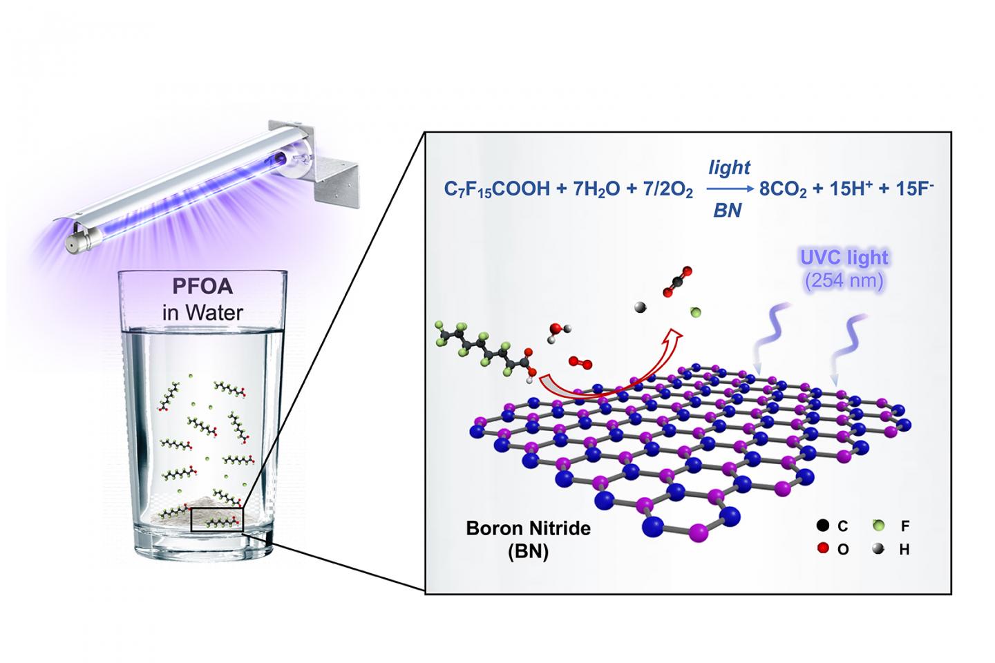 image: An illustration of the boron nitride photocatalysis that destroys the pollutant PFOA in water.