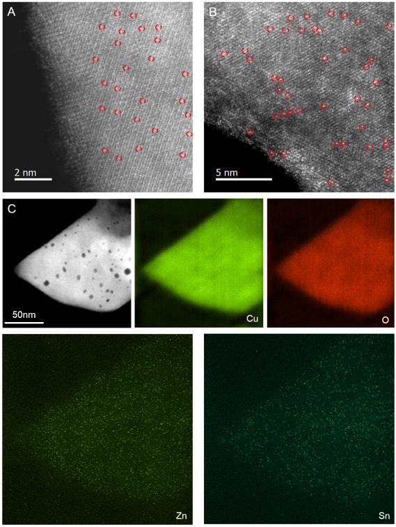 image: (A) AC HAADF-STEM image of Sn1/CuO, (B) AC HAADF-STEM and (C) HAADF-STEM images as well as the corresponding EDS mappings of 0.1Zn1-Sn1/CuO. The bright dots marked with the red circles in images A and B indicate the single atom.
