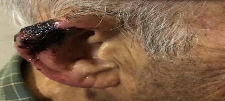 image: Patient's ear pre-treatment - An elderly patient on anti-coagulation therapy with squamous cell cancer of ear.