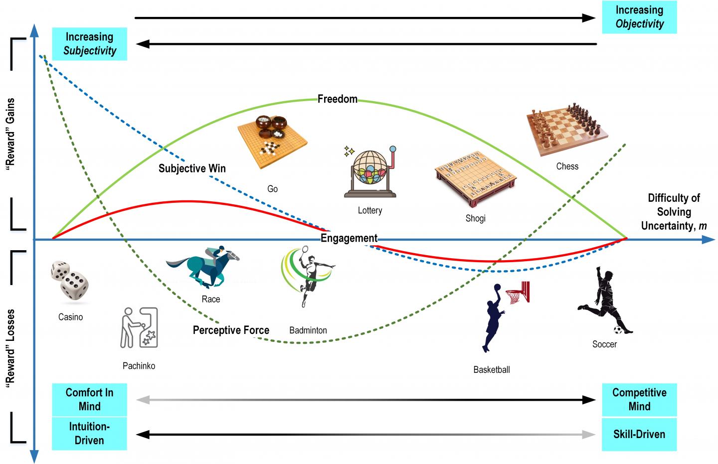 image: The graph depicts various quantities of the model plotted against the difficult of solving uncertainty in a game (m). Representative examples of board games, gambling games, and sports are placed on the graph according to their inherent characteristics.