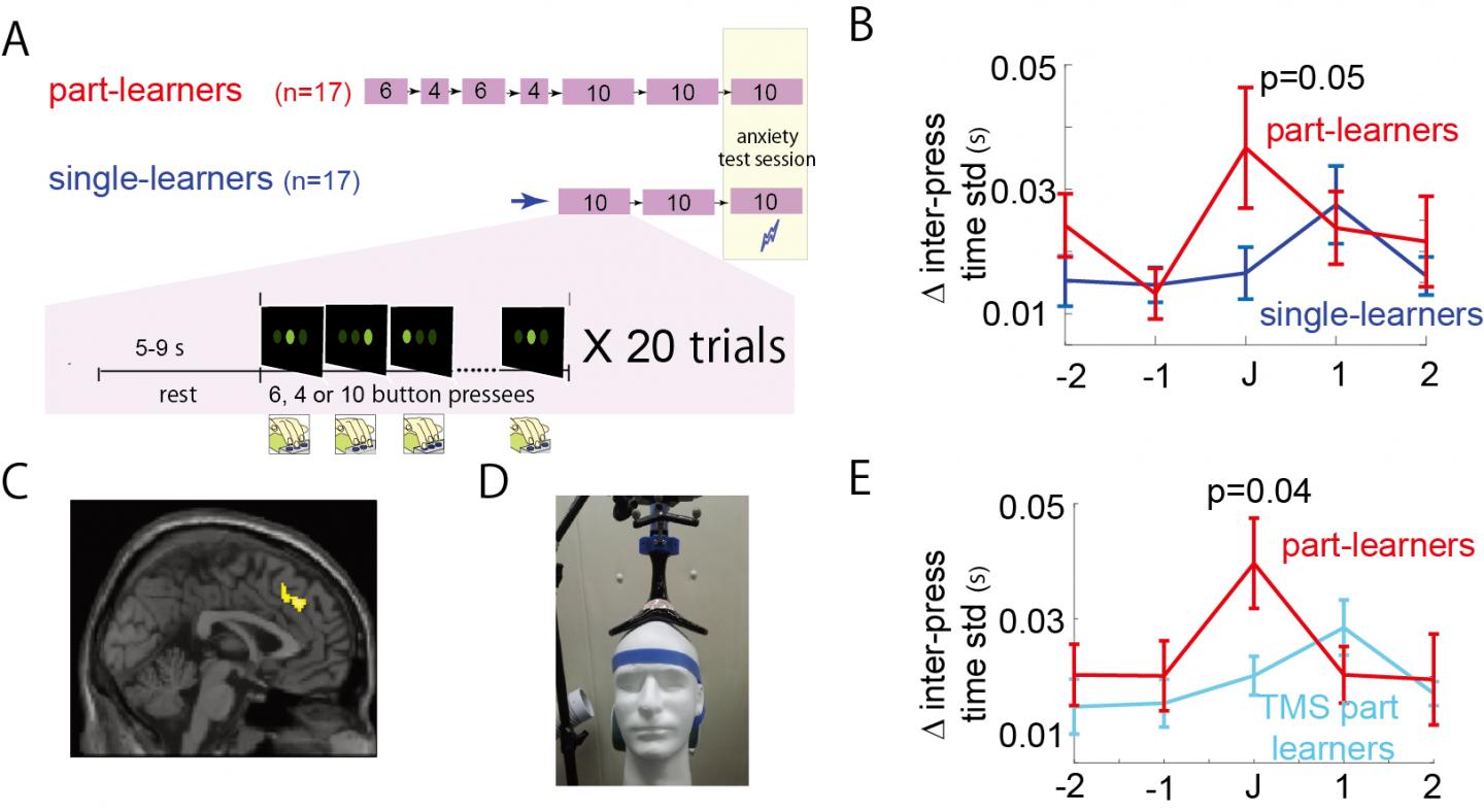 In general, specific motor skills, such as those used in tennis or playing the piano, require repeated practice to memorize the motions and their order. In the new study, the researchers simulated this practice on a computerized 10-step rapid button press task. Part-learners learned the task in two parts, one 6 steps long and the other 4 steps long. Finally, they practiced all 10 steps at once. Single-learners, on the other hand, learned the 10-step rapid button presses together without breaking them into parts. After the learning, both groups of learners were asked to conduct the entire 10-step task and given an electrical shock if they made a mistake during the performance (Fig. 1A, anxiety test session).