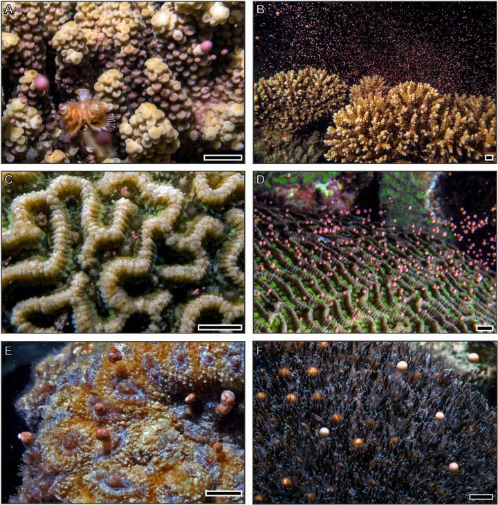 image: In-situ spawning of the studied species. (A) At ~30 minutes prior to spawning, Acropora eurystoma colonies can be observed in a 'setting' mode, in which egg-sperm bundles are already visible at the mouth-opening of each polyp. (B) Synchronized whole-colony spawning of A. eurystoma. (C) Partial spawning of Platygyra lamellina without the formation of egg-sperm bundles, in contrast to (D) Synchronized whole-colony spawning of egg-sperm bundles by P. lamellina. (E) Acanthastrea echinata spawning and (F) a male Galaxea fascicularis colony. Scale bars indicate ~1 cm.