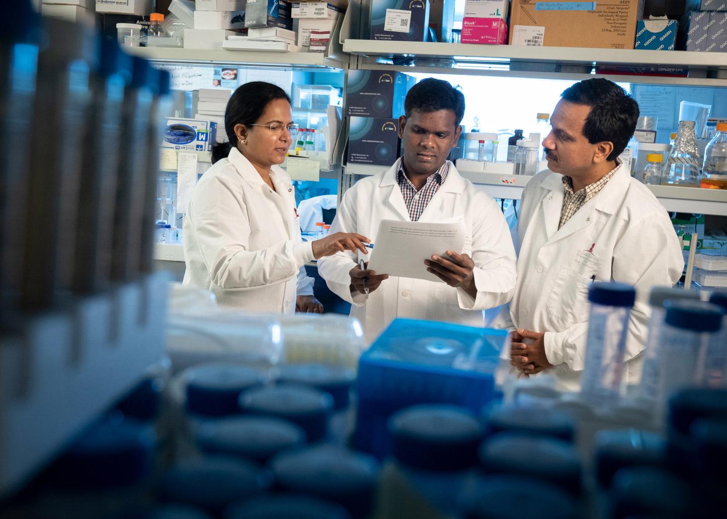 image: Left to right: Thirumala-Devi Kanneganti, Ph.D., a member of the St. Jude Department of Immunology, with postdoctoral fellows Kesavardhana Sannula, Ph.D. and Parimal Samir, Ph.D.