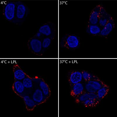 image: Lipoprotein Lipase facilitates binding of very low density lipoprotein particles (red) to breast cancer cells (blue cell nuclei).