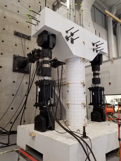 image:Â Specimen of the hybrid sliding-rocking bridge column tested in the Center for Infrastructure Renewal's large-scale experimental facilities.
