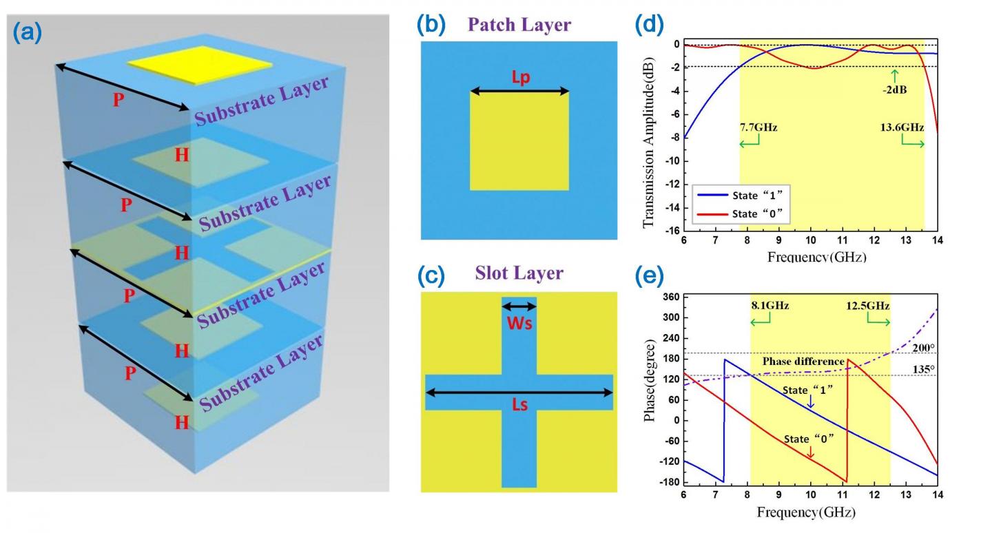 To overcome this difficulty, the authors adopted a multi-layer transmission-type structure, as shown in Figure 1(a), to implement the digital particles. The structure is composed of four identical metallic square patches (see Figure 1(b)), a metallic cross-shaped slot layer (see Figure 1(c)), and dielectric substrates. By adjusting the sizes of square patches, the phase responses of transmitted EM waves would be changed accordingly. After optimizations between the higher transmittance and sufficient phase difference of 1-bit coding, two digital particles with different geometries were designed to represent the digital states '0' and '1'. As displayed in Figures 1(d) and 1(e), the phase difference between the two particles was kept near 180° to ensure the 1-bit coding effect in the wideband range of 8.1-12.5 GHz with high transmittance, corresponding to an over 40% relative bandwidth.