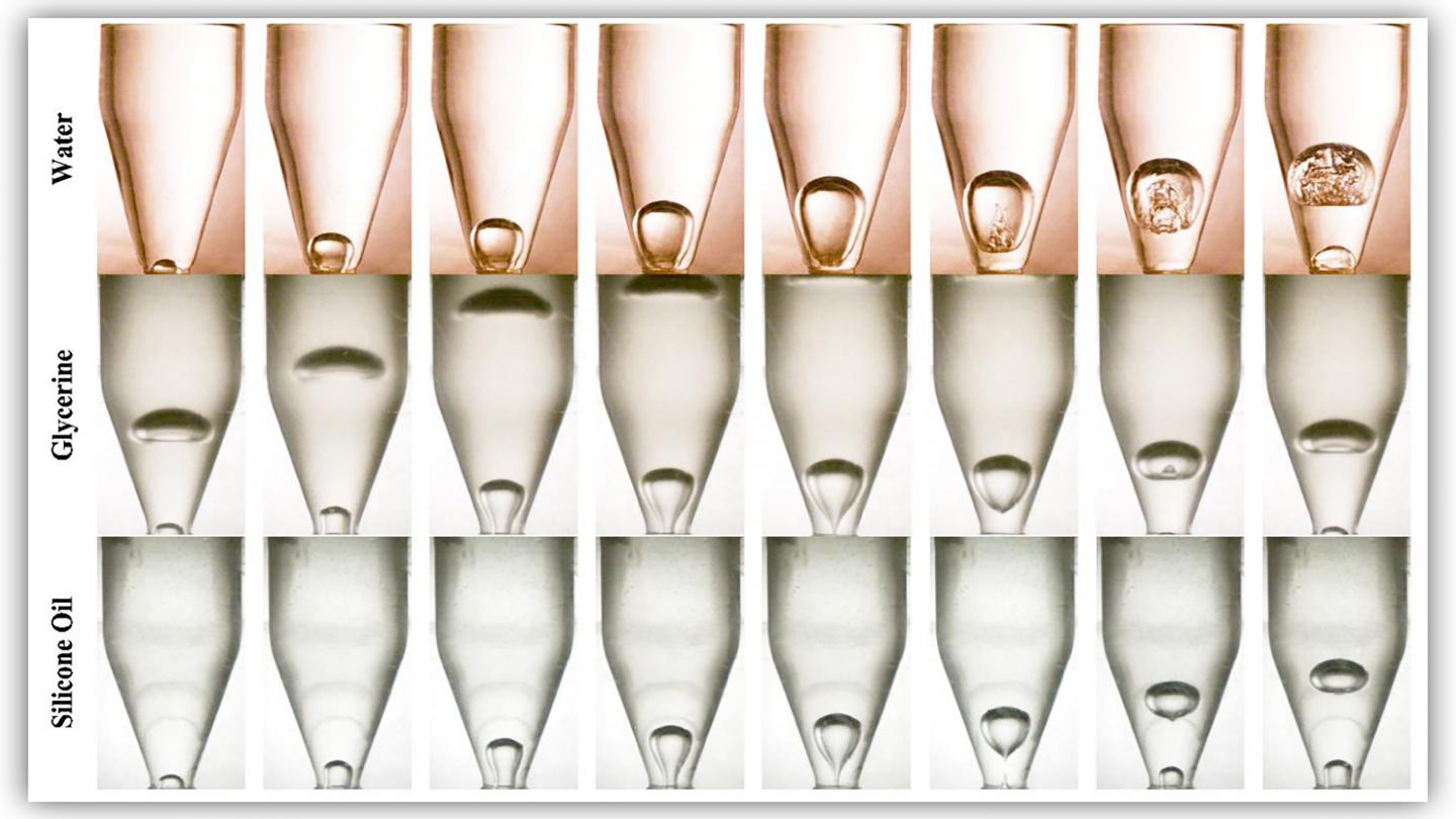 "We've also observed an encapsulated bubble while discharging fluid in a vertically upended bottle," Rohilla said. "Encapsulated bubbles have pinch off sites outside the bottle mouth, contrary to intuition. The presence of a violent ejector jet within inviscid fluids, in which liquid becomes thin due to almost no internal friction, and its complete absence within viscous fluids control the periodicity of the bubbles."