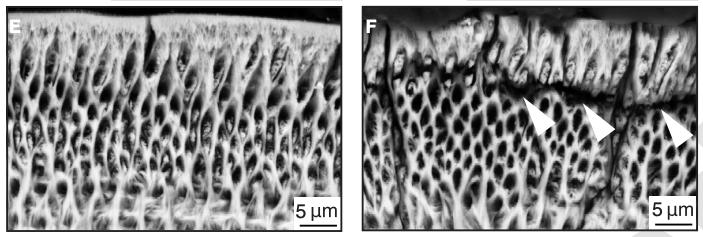 image: High-magnification of tooth enamel in normal (control) mice (left) and mice with ORAI1 gene mutation (right) by scanning electron microscope.