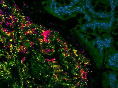 But using a technique called whole-mount confocal microscopy to study the intestines of mice, he and his colleagues found that the bacteria actually live in a unique ecological niche, deep within the crypts of the colon, "and thus in intimate contact with the gut mucosal immune system," he says.