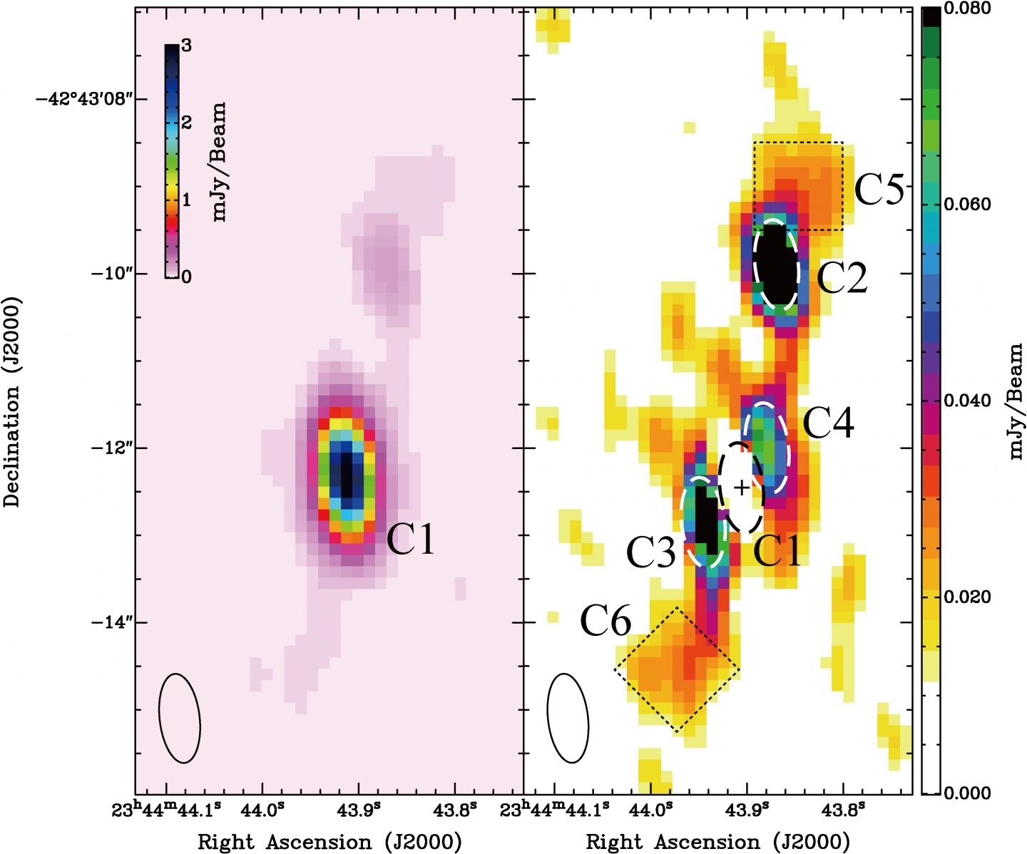 A team led by Takaya Akahori at the National Astronomical Observatory of Japan used the Australia Telescope Compact Array (ATCA) to search for black hole jets in the Phoenix Galaxy Cluster with the highest resolution to date. They detected matching structures extending out from opposite sides of the central galaxy. Comparing with observations of the region taken from the Chandra X-ray Observatory archive data shows that the structures detected by ATCA correspond to cavities of less dense gas, indicating that they are a pair of bipolar jets emitted by a black hole in the galaxy. Therefore, the team discovered the first example, in which intra-cluster gas cooling and black hole jets coexist, in the distant Universe.