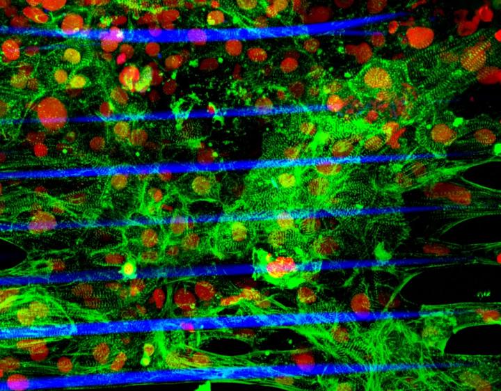 image: The image shows the human stem cell-derived cardiac microtissue grown on a fiber-based scaffold fabricated using a laser-guided bioprinting technology (Red: cell nuclei, Green: cardiomyocytes, Blue: fibers).