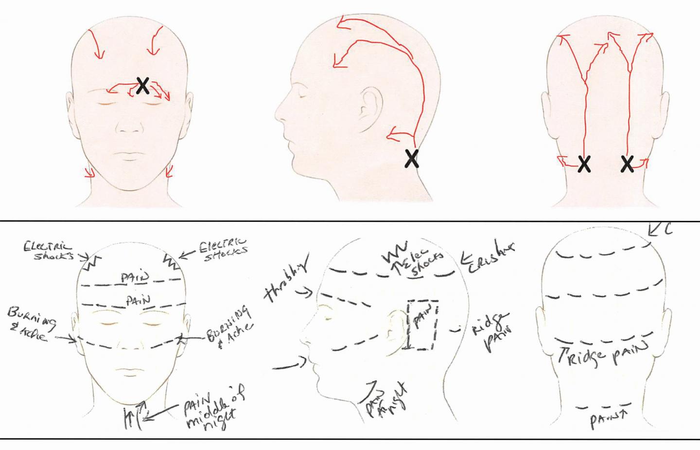 image: Migraine patients whose pain sketches show more "typical" patterns (top) have better responses to migraine trigger site surgery.