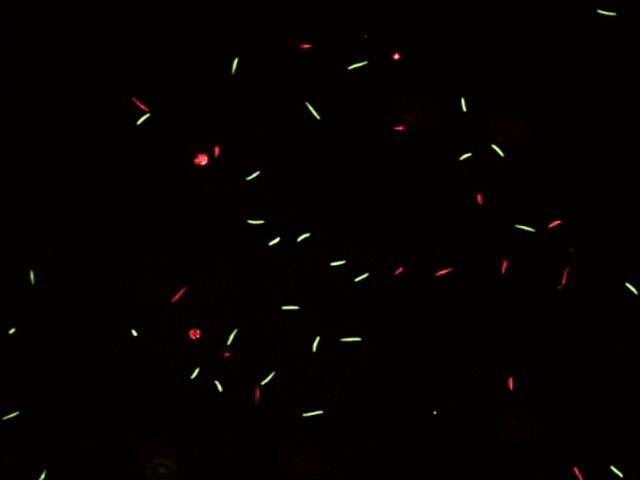 image: The red and green spots are live (green) and dead (red) sperm.