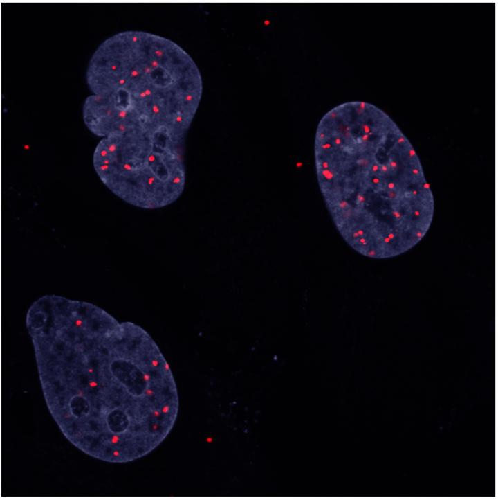 image: Losing their inhibitions: Cells prefer not to be crowded and stop proliferating once too densely packed. A technique called proximity ligation analysis reveals an interaction between two proteins (YAP and YY1) in the nuclei of human Schwann cells. YAP and YY1, working together, can shut off this behavior. The red dots represent the interaction, nuclei are stained in blue.