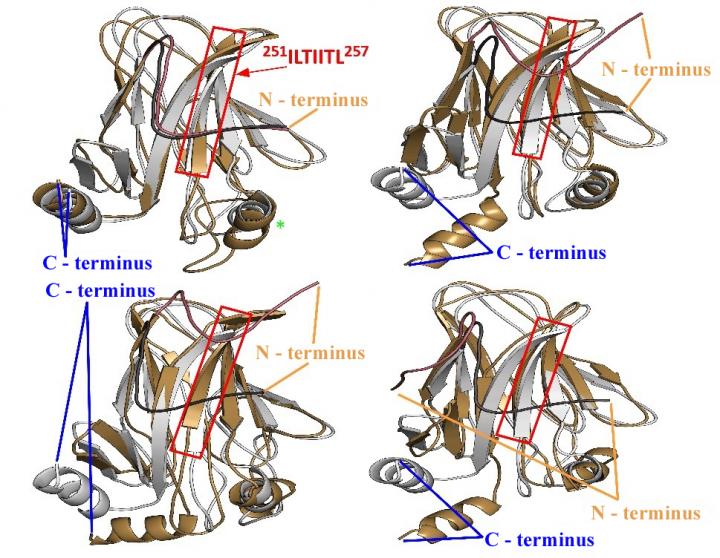 image: A model produced by scientists at Rice University shows the conformational changes caused by a mutation in the cancer-fighting p53 protein. At top left, the red box highlights the aggregation-prone sequence protected by the N-terminus tail in wild-type p53 but exposed by the mutation of a single amino acid. The strongest deviation happens in the domain at the green asterisk. The other three models show "open" conformations at the C-terminus caused by the mutation.