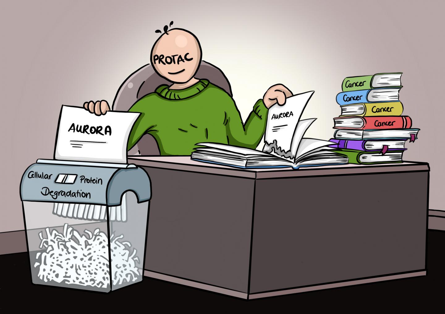 Wolf describes the mode of action of this substance as follows: "The tumor needs certain tumor-promoting proteins, which we can imagine as the pages of a book. Our PROTAC substance tears out the 'Aurora' pages and destroys them with the help of the machinery that every cell has to degrade old and broken proteins." PROTAC thus "shreds" the Aurora protein, as it were, until nothing of it remains.