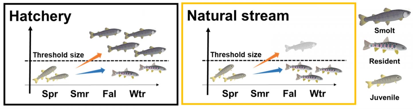 However, according to these research results, very few of the captive-bred fish released into natural streams during their first early summer exceed the threshold size by fall, with hardly any individuals becoming smolts.